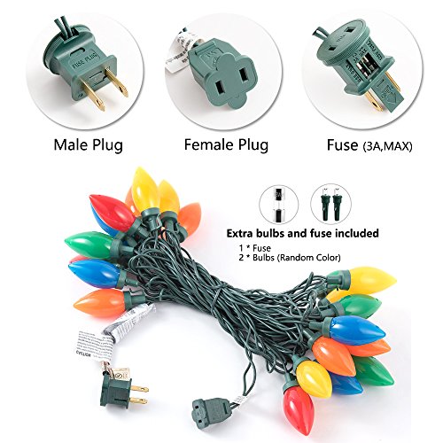 -. Feature : ● PRODUCT DIMENSIONS - String Lights Total Length 23Ft: Including 16Ft lighted length ; 6.6Ft lead with male plug ; 8In lead with female plug ; 8In spacing between LED lights. (NOTE: The male plug extension to 6.6Ft, easier to place your light position) / ● CONNECTABLE - Allows up to 90 sets to be connected end to end, If one light goes out, the rest stay lit. You can decorate your home with desired length. / ● SAFETY GUARANTY - UL Listed, IP44 waterproof level for outdoor & indoor use; Bulbs are virtually unbreakable, and colors never fade, chip or crack. The male plug adopts overload protection (fuse), 1 replacement fuses & 2 Extra bulbs included. / ● ENERGY SAVING - Energy efficient LED bulbs reduce power needs by up to 90%. Excellent heat dissipation and flicker free lighting than incandescent string lights; long lifespan up to 50,000 hours. / ● DECORATING IDEAS - Great for indoor or outdoor lighting decorations. Hang these multi color LED string lights from your awning, around your Christmas tree, or with your other house decorations for a beautiful light display!