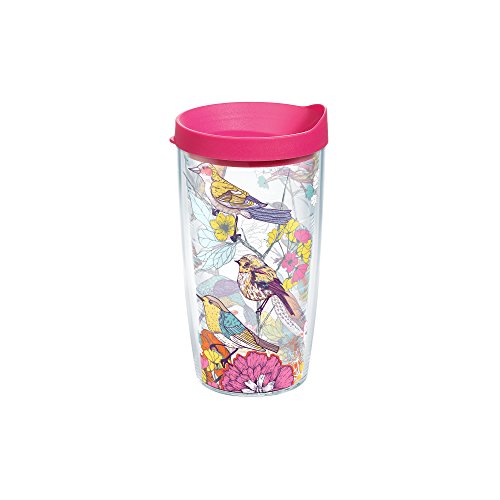 Tervis 1208556 Sketched Birds Wrap Tumbler with Fuchsia Lid, 16 oz, Clear