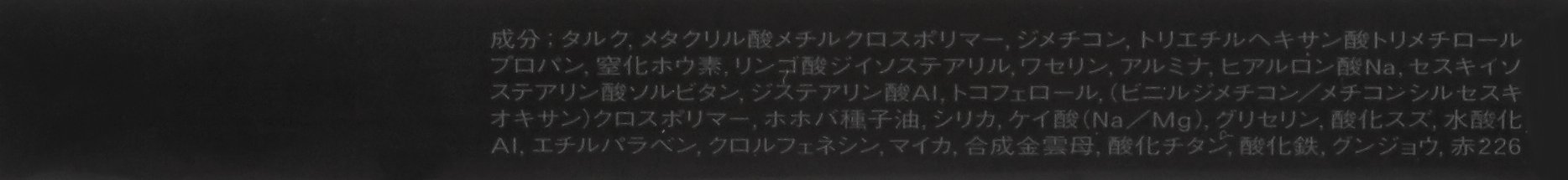 Talc, methyl methacrylate crosspolymer, dimethicone, trimethylolpropane triethylhexanoate, boron nitride, diisostearyl malate, vaseline, alumina, hyaluronic acid Na, sorbitan sesquiisostearate, Al distearate, tocopherol, (vinyl dimethicone / methicone