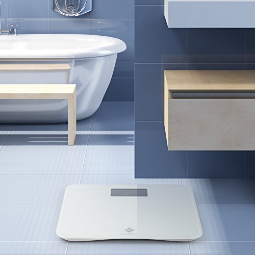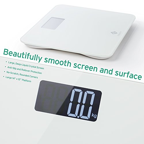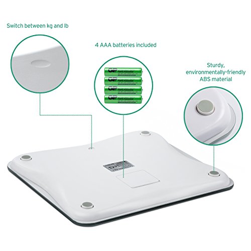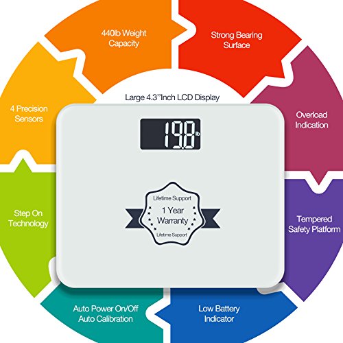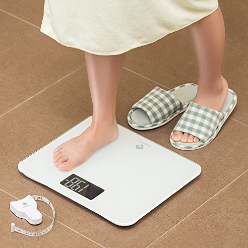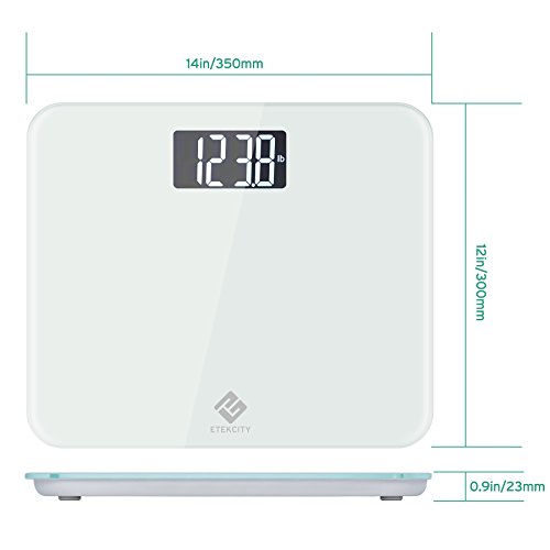-. Feature : Sleek, Modern and luxury bathroom-looking scale: Built with a thick and durable 8 mm clear tempered glass platform. It is shiny, smooth. Perfect for any age, any bathroom and any house hold / Large LCD Display and Easy to Read Backlit: It is large enough to accommodate just about any size individual and also makes it significantly easier for older people to stand on without feeling off balance / Accurate and consistent: With step on technology, it can measure in both pounds and kilograms. 440 lb. Weight capacity. Auto on, off, and zero. Work quickly and flawlessly / Power saving function: Auto-off, low battery and overload indication help conserve battery life and extend product lifespan / Comes with a nice 5 feet measuring tape in inches and centimeters and a 1 year warranty from Etekcity; CE/FCC/ROHS approved; batteries (included)