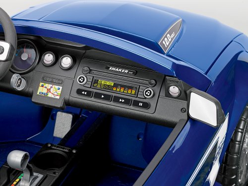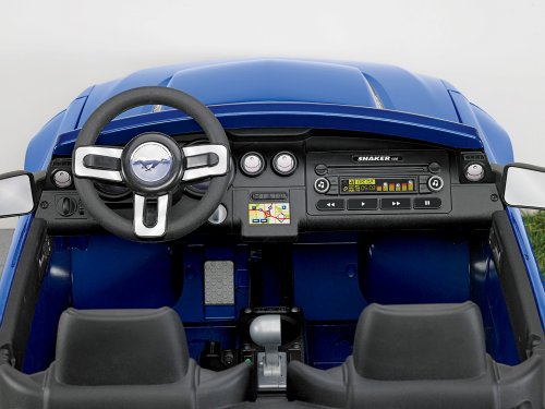 -. Feature : Flashy "chrome" wheels / Drives on hard surfaces, wet grass and rough terrain / Power Lock Brakes / Drives two speeds forward 2.5 and 5 mph, max / Includes 12-volt battery and charger