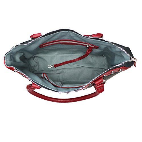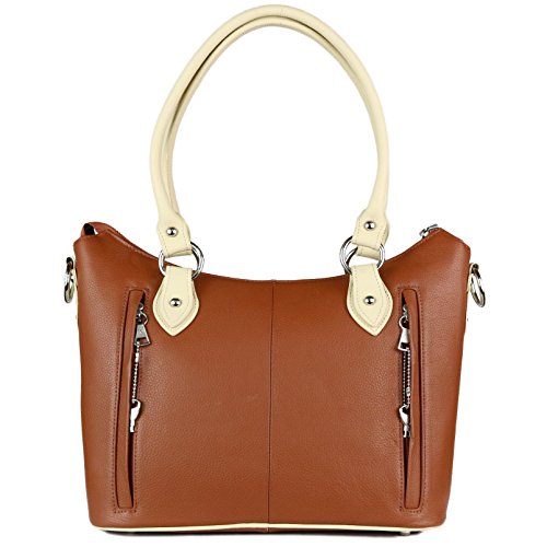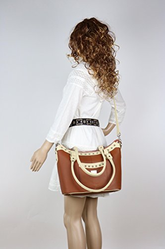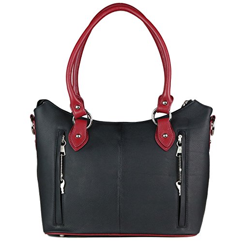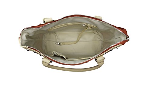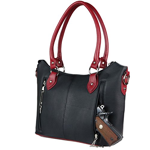 -. Brand : Miss Conceal -. Department : womens -. Feature : TWO-TONE CONSTRASTING 100% GENUINE LEATHER - Accented with bold silver studs/ Front decorative pocket with magnetic closure/ Branded with a signature Miss Conceal emblem / ROOMY INTERIOR - Top zippered access / Fully lined 100% polyester / Two open slip pockets and a zippered P.R.Ivacy pocket / Interior leather lanyard with swivel snap for keys / DUAL CARRING STRAPS/HANDLES - Round handles measure 22" long with 9-1/2" drop / Optional crossbody adjustable strap measures 28"- 48" by 1" (Drop 13" - 23") / Quality, solid silver hardware / LOCKING AMBIDEXTROUS CONCEALMENT POCKET - Access to gun pocket on both ends / Locking concealment zippers with 4 keys / Includes universal elastic, nylon holster / Concealment pocket measures 6" Tall x 9" Wide / SPACIOUS SIZE - Dimensions: 15" (Top) 12-½"(Bottom) Wide x 9 ½ (Lowest point)" Tall x 5" deep Wide x 5" Deep / Bag stand uP.R.Ight with a flat base and raised button feet -. ProductGroup : Shoes -. ProductTypeName : HANDBAG -. Size : Medium -. Title : Concealed Carry Purse - The Renee Two Tone Studded Tote by Miss Conceal - Genuine Leather