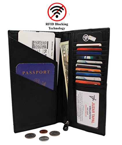 Product Description J.T.C accessories are handcrafted using selected material of high quality Genuine Leather and Aluminum liner for R.F.I.D ( Radio Frequency Identification Blockers ) each piece is individually designed and constructed to the high standard to ensure your J.T.C wallet will last many year. Builtin Elastic Closer Slip-in pocket on back Fits any Smart Phone Zipper Pocket 3 slip-in pockets 11 Card Slot 1 Window ID Passport Slot Boarding Pass Slot 4.75 W x 9.0 H Imported 0
