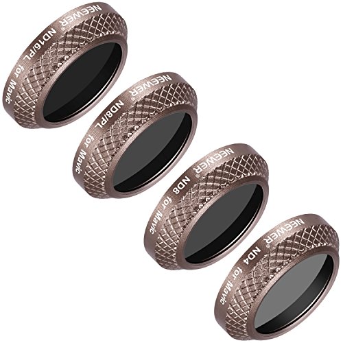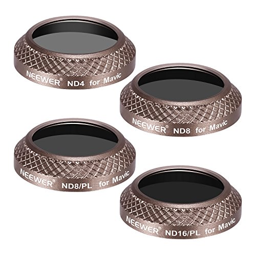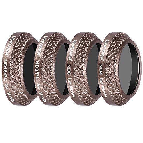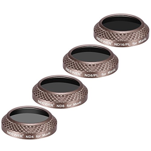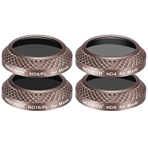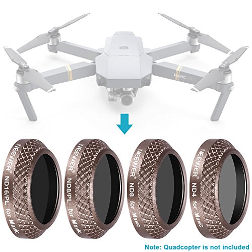 NOTE: 1.These filters can be mounted ONLY WHEN the original stock filter is still in place. Please let the filter cover the gold thread on the lens when installing, or your drone will report a camera gimbal error resulting in it can not work properly.2. DJI Mavic Drone is not included Description: Specifically designed for DJI Mavic Pro. The filters are designed to stay on the camera during startup and calibration. Ultra-Light design (0.05 ounce / 1.42 grams) for smooth gimbal operation can avoid causing the gimbal to overload. Made of HD optical glass, which can increase light transmission without dark corners. Aluminum alloy frame sealing ring makes it have better tightness which can avoid falling or loosing. The multilayer coating design makes the lens filters lightweight and durable. It is ideal for shooting in very bright conditions, capturing professional quality images and videos. ND4 and ND8 Filters: ND lens filters reduce the amount of light reaching the film without affecting the color (ND4 reduces the exposure by 2-stops,ND8 reduces the exposure by 3-stops). They allow you to have more control of the quadcopter's aperture, exposure time and sensor sensitivity settings and produce a shallower depth of field, or achieve a sharper photo. ND8/PL and ND16/PL Filters: ND/PL filters are great for removing unwanted reflections from non-metallic surfaces and increase contrast and color saturation. They are rotatable, which can allow you to properly orient the filter based on ambient light and allow you to properly orient the filter based on ambient light. Specification: Color: Gold Material: HD Optical Glass; Aluminum Alloy Frame Each Filter Weight: 0.05 ounce / 1.42 grams Package Dimensions: 0.8 x 3.6 x 3.7 inches / 2.1 x 9.2 x 9.4 centimeters Package Contents: 1 x ND4 Filter 1 x ND8 Filter 1 x ND8/PL Filter 1 x ND16/PL Filter 0