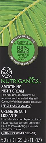 Studio : The Body Shop Publisher : The Body Shop Binding : Health and Beauty Product Description Nutriganics smoothing night cream is an extra rich moisturizing cream that melts into skin with no greasy after feel. Clinically proven to reduce the appearance of lines and wrinkles in just 4 weeks. Works to improve skin's elasticity and tone while moisturizing up to 12 hours. Best for women who are concerned about the first signs of aging. Contains community fair trade babassu oil, organic cold pressed coconut oil, olive oil and mallow flower which soften smoothes and revitalizes the skin. Also contains red grape, plantain and elderflower to help improve skin tone and texture. Buddleja and thyme give antioxidant protection from environmental aggressors. 0