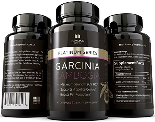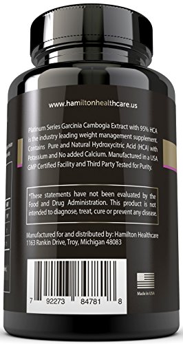 -. Binding : Health and Beauty -. Brand : Hamilton Healthcare -. EAN : 0792273847610 -. Feature : MOST PURE AND POTENT CONCENTRATION AVAILABLE: 100% PURE Garcinia Cambogia Extract with maximum strength 95% HCA studied for its potential to reduce appetite, decrease body fat, and help prevent weight gain. Combined with a healthy diet and exercise, your goals can be achieved quickly! / SAFE AND EFFECTIVE: Our supplement is made with potassium to increase bioavailability in the body. Free of fillers, binders, and artificial ingredients. NO magnesium stearate, silicon dioxide or calcium, which can block absorption hydroxycitric acid (HCA). / ALL NATURAL FORMULA WITHOUT JITTERS: Our non-stimulating formula is a favored alternative to other supplements that can have undesirable effects. Garcinia Cambogia has been linked to mood boosting effects and can help you stay positive and focused during your journey! / SCIENTIFICALLY FORMULATED FOR MAXIMUM QUALITY: Hamilton Healthcare supplements have passed extensive third-party quality control testing before being bottled and sold. We use only FDA regulated GMP certified manufacturing facilities in the USA. / GREAT VALUE! All of our products are backed by our 60-day, no questions asked money back guarantee and world-class customer service!! -. Label : Hamilton Healthcare -. LegalDisclaimer : These statements have not been evaluated by the Food and Drug Administration. This product is not intended to diagnose, treat, or prevent any disease.Actual product packaging and materials may contain more and different information than what is shown on our website. We recommend that you do not rely solely on the information presented and that you always read labels, warnings, and directions before using or consuming a product. Please see our full disclaimer below. -. Manufacturer : Hamilton Healthcare -. MPN : HH-PSGC9 -. PackageQuantity : 90 -. PartNumber : HH-PSGC9 -. ProductGroup : Health and Beauty -. ProductTypeName : HEALTH_PERSONAL_CARE -. Publisher : Hamilton Healthcare -. Studio : Hamilton Healthcare -. Title : Hamilton Healthcare Platinum Series Garcinia Cambogia Extract Weight Loss Supplement with HCA (90 Pills) -. UPC : 792273847610