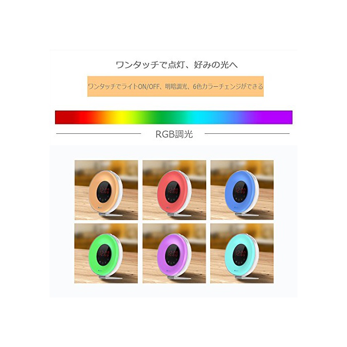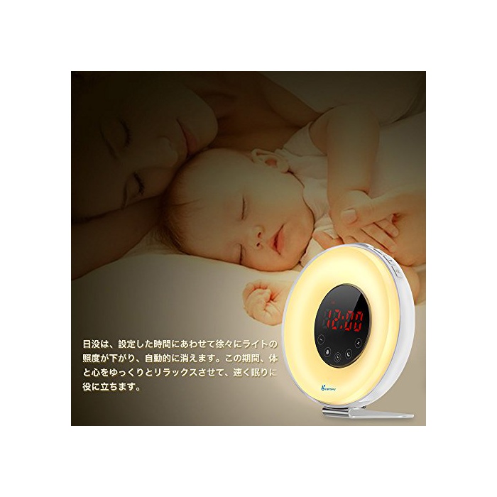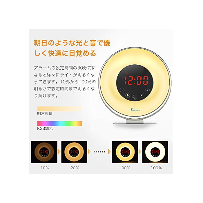【일출&일몰 알람】자명종은 일출과 일몰을 재현하는 것 를 할 수 있습니다.일출과 일몰 시간을 설정 하면,라이트는 자동 점등 하고 있습니다. 일출의 밝기는 10%부터 100%까지 점등하고, 일몰은 상반에서,100%부터 10%까지 점등 하고 있습니다.