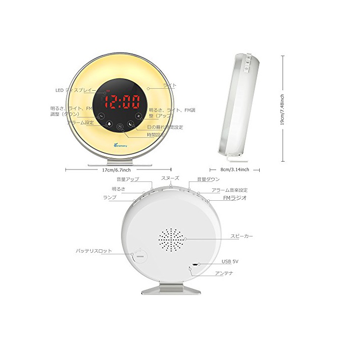【FM라디오 기능】라디오 주파수:88~108MHz,전압/전류:5V/3W,전원:USB전원/건전지(CR2032×1개) ※건전지를 사용한 경우,빛의 자명종은 동작하지 않습니다.알람음 만 가(이) 되기 때문에 주의하여 주십시오.