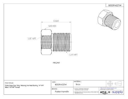 Parker Brass Pipe Fitting, Reducing Hex Head Bushing, 1/4" NPT Male X 1/8" NPT Female