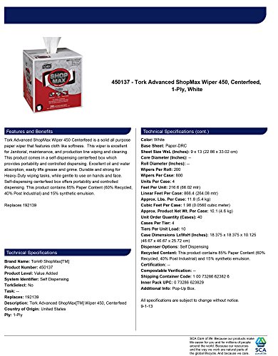 ReleaseDate : 2017-09-18 Studio : SCA Americas LLC Publisher : SCA Americas LLC Binding : Misc. Product Description The Tork Advanced ShopMax Wiper 450 Centerfeed is a solid all purpose paper wiper that features cloth like softness. This wiper is excellent for janitorial, maintenance, and production line wiping and cleaning. This product comes in a self-dispensing centerfeed box which provides portability and controlled dispensing. Excellent oil and water absorption, easily lifts grease and grime. Durable and strong for Heavy-Duty wiping tasks, while gentle to use on hands and face. Self-dispensing centerfeed box offers portability and controlled dispensing. This product contains 85% Paper Content (60% Recycled, 40% Post Industrial) and 15% synthetic emulsion. 0