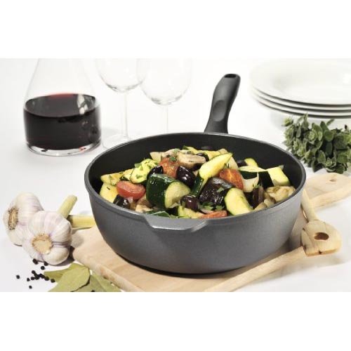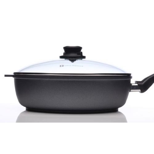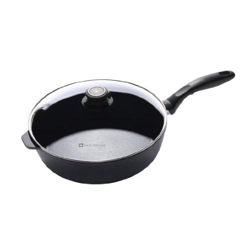 A true kitchen workhorse, the Swiss Diamond 4.3 qt (11”) saute pan has deeper sides than a fry pan, making it perfect for sauces, vegetables, cubed meat, etc. Includes lid. The included tempered glass lid allows you to monitor food without lifting the cover, maintaining flavor and keeping food from drying out. The rotating lid knob opens or closes a steam vent to release or contain moisture as needed. Used by discerning home chefs around the world, Swiss Diamond’s PFOA-free cookware features unsurpassed nonstick performance for healthy cooking and easy clean-up. The patented nonstick coating, reinforced with real diamond particles, allows oil-free cooking and cleans up with just warm soapy water. No more scrubbing and soaking! Swiss Diamond’s patented nonstick coating is reinforced with real diamonds for excellent durability and resilience. Why diamonds? Three reasons: they are durable, they are naturally nonstick, and they conduct heat better than any metal. A perfect combination for a lifetime of cooking excellence. Swiss quality is visible in every aspect of Swiss Diamond cookware. Heavy-duty cast aluminum will never warp, while the perfectly flat base distributes heat evenly and will not tip or spin. The rivet-free interior prevents unsightly food build-up that can lead to bacterial growth. The ergonomic handle, designed for comfort and balance, stays cool on the stovetop. All Swiss Diamond products are oven-safe up to 500 degrees F (260 degrees C) and suitable for use on gas and electric cooktops – induction series sold separately. Made in Switzerland.Feature