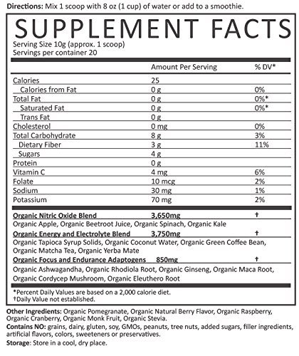 -. Binding : Health and Beauty -. Brand : Ora Organic -. EAN : 0856720007016 -. Feature : ENERGY BOOSTER for working out or use as a coffee substitute to stay alert through the day / ORGANICALLY SWEET with Organic Beets, Berries and Pomegranate for a real flavor kick! No added sugar or artificial flavors (we wouldn't do that to you)! / 80 MG OF CAFFEINE FROM ORGANIC GREEN COFFEE BEAN and formulated with yerba mate, matcha tea, eleuthero root and ginseng to give a jitter-free energy boost.* / ORGANIC NITRIC OXIDE BOOSTING FRUITS & VEGETABLES included to support healthy blood flow,* strength,* endurance* and includes our ORGANIC ADAPTOGEN BLEND to help promote focus*, endurance* and stress relief.* / CERTIFIED USDA ORGANIC & vegan pre-workout powder. -. IsAdultProduct : 0 -. Label : Ora Organic -. LegalDisclaimer : *These statements have not been evaluated by the Food and Drug Administration. This product is not intended to diagnose, treat, cure, or prevent any disease. -. Manufacturer : Ora Organic -. MPN : ORA-PRE-PWD-POM-20-RE-AMZ -. PackageQuantity : 1 -. PartNumber : ORA-PRE-PWD-POM-20-RE-AMZ -. ProductGroup : Health and Beauty -. ProductTypeName : HEALTH_PERSONAL_CARE -. Publisher : Ora Organic -. Studio : Ora Organic -. Title : Ora Organic Energy Booster Supplement - Pre Workout, Beet and Berry Flavor Nitric Oxide Booster with Adaptogens, Made with Green Coffee Bean, Matcha, Ginseng -. UPC : 856720007016