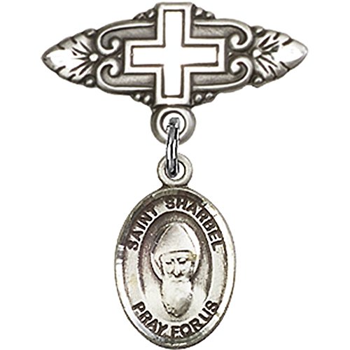 -. Title : Sterling Silver Baby Badge with St. Sharbel Charm and Badge Pin with Cross 1 X 3/4 inches