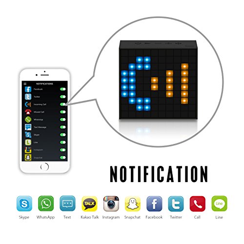 -. Feature : Superior sound quality smart bluetooth speaker with extra BASS. A world class 3" 5-watts speaker professionally tuned by Divoom. Equipped with the latest 3D digital calculation and low-range bass enchantment technology / Free proP.R.Ietary mobile application for both iOS and Android systems, Compatible with iOS 7 and up on iphone4/4s/5/5s/6/plus, iPad 2/3/4, ipad air & mini1/2; and most Android devices (including: Google Nexus 4/5/6/7/9/10, HTC One, LG, Samsung and others). Support third party music application. / Advanced notification system, provides instant on-screen notification for: incoming call/text, Facebook/Tweeter updates and other social media events. LOTS FUN, and great for any indoor or backyard BBQ party / Create your own drawings and animations series via the user-friendly application, or choose ours from the application gallery. / Greatly improve the sleep quality with the built-in temperature sensor + Intelligent timer clock with both sceneries and sound, All speakers purchased through the Divoom's official Amazon store (Divoom Official) come with the one year limited warranty.