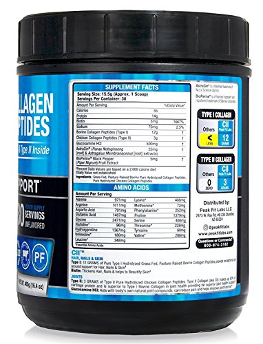 Joints -Type II: 3 GRAMS of Type II Pure Hydrolyzed Chicken Collagen Peptides. Type II Collagen makes up 50% of cartilage protein and is superior to Type I Bovine Collagen for joint health providing far superior joint health support