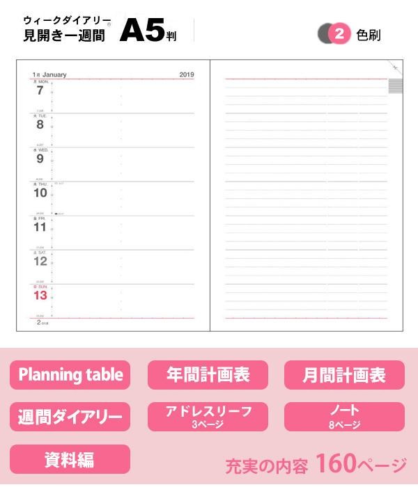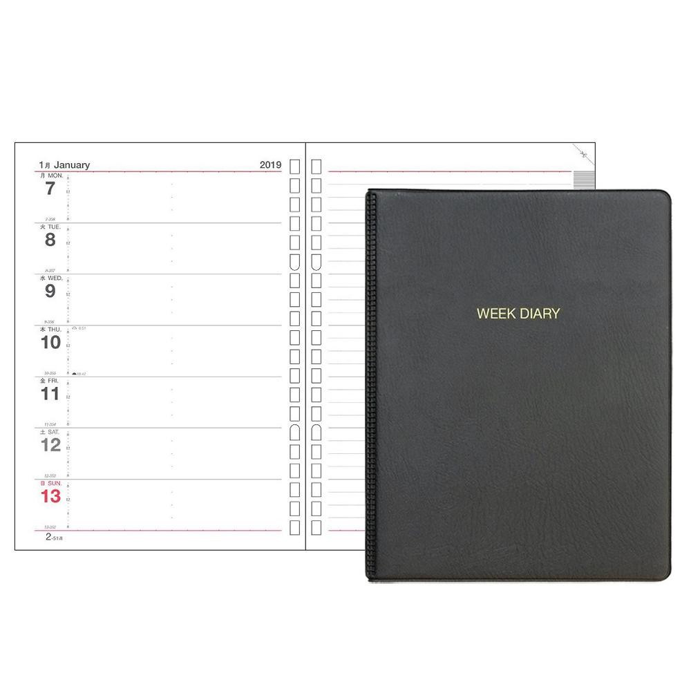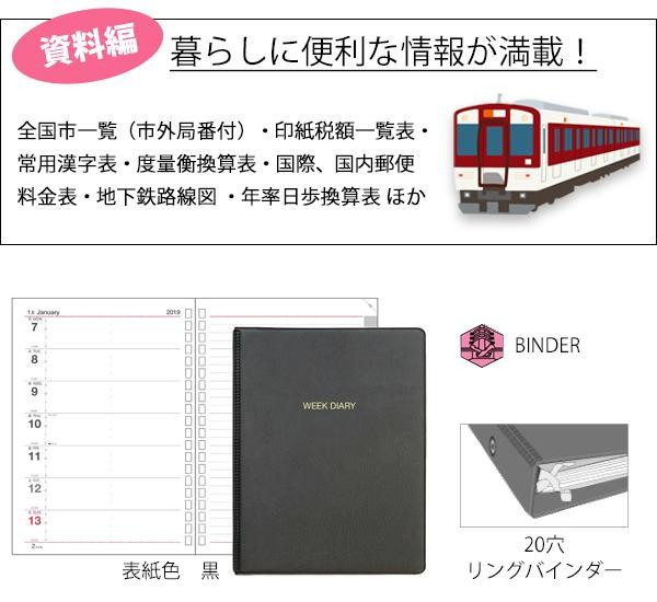 | 仕様 | 塩ビ製表紙 リングバインダー(20穴) 日記リーフ(20穴)、インデックス(C-715)付 2019年版・1月始まり |
