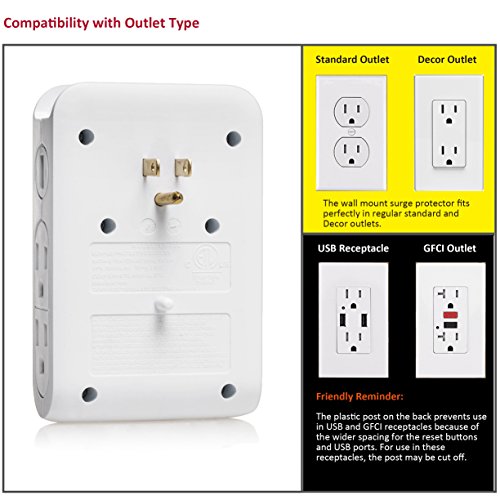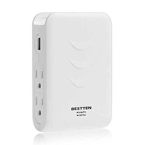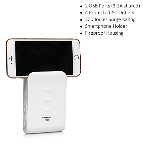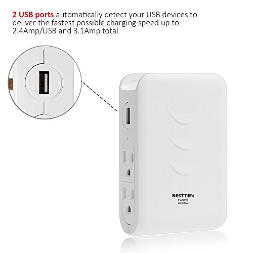 Bestten Side Wall Outlet Adapter Surge Protector with 2 USB Charging Ports (3.1A) and 4 Outlets, Top Cell Phone Dock, Portable for Travel or Home/Office Use, ETL Listed