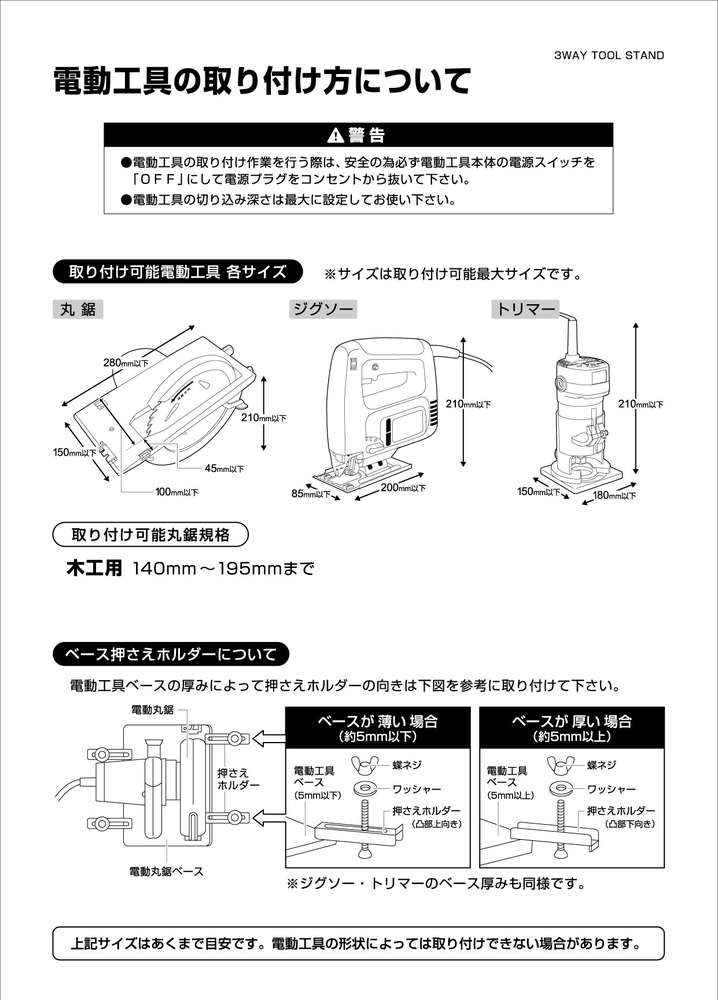 ●145~190mmまでの丸のこが取付可能