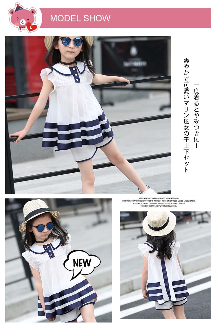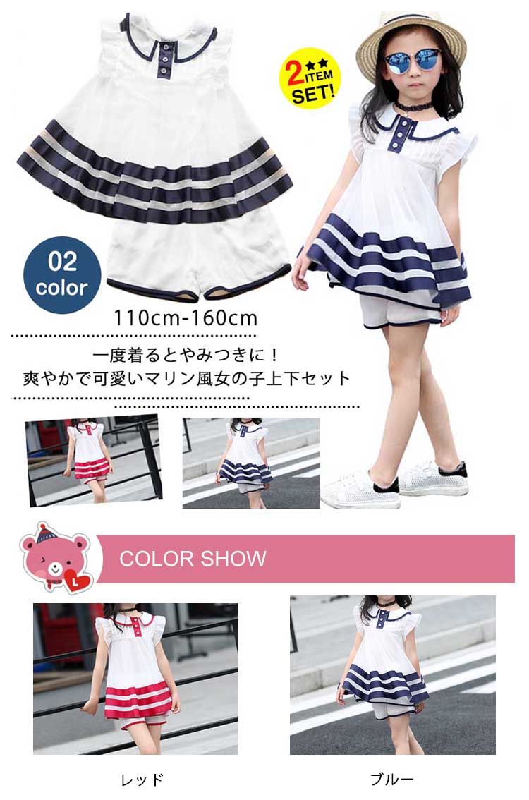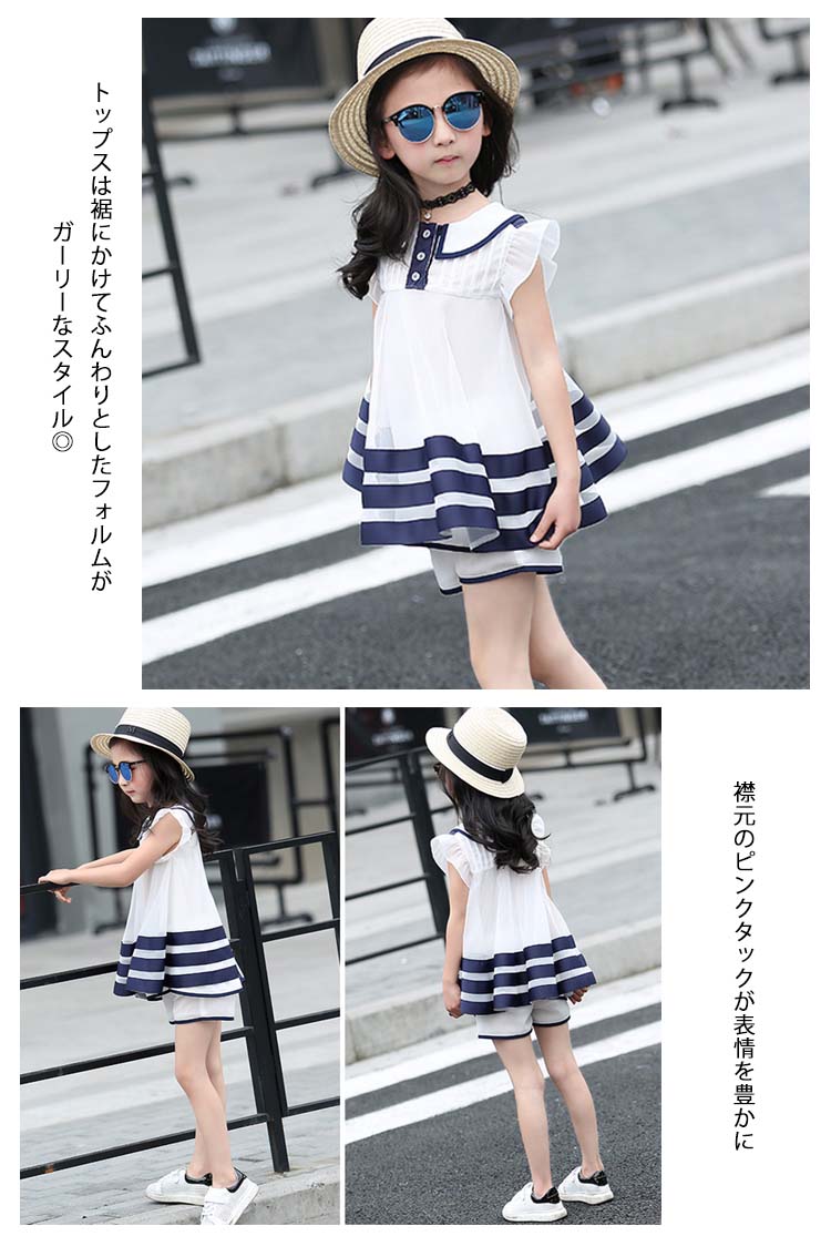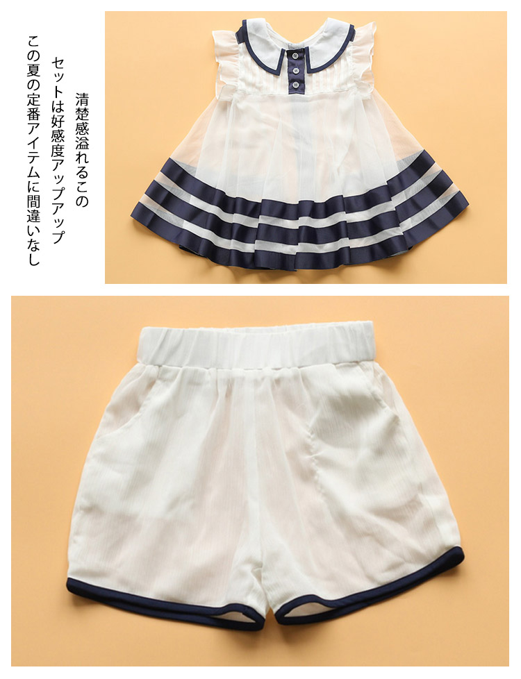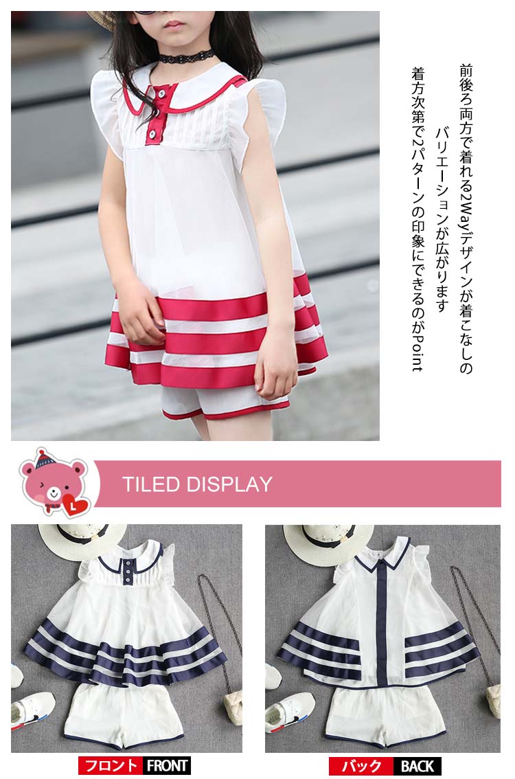| 一度着るとやみつきに!爽やかで可愛いマリン風女の子上下セットトップスは裾にかけてふんわりとしたフォルムがガーリーなスタイル◎襟元のピンクタックが表情を豊かに女の子に大人気のフリル袖が甘いテイスト満載前後ろ両方で着れる2Wayデザインが着こなしのバリエーションが広がります着方次第で2パターンの印象にできるのがPoint清楚感溢れるこのセットは好感度アップアップこの夏の定番アイテムに間違いなし | |