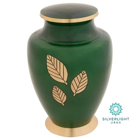 Silverlight Urns Strong Tree Brass Urn, Adult Green & Gold Cremation Urn with Leaf Design, 10 Inches Tall