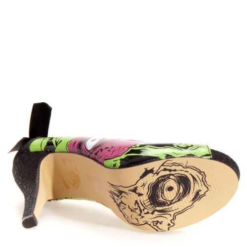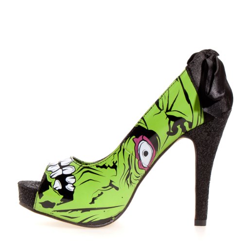 Product DescriptionOpen toe platform pumps with Zombie print. These have a satin ribbon, high heel, and concealed platform.0
