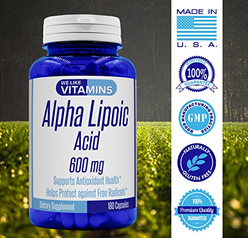 BEST VALUE Alpha Lipoic Acid 600mg on Amazon -180 Capsules- 6 month supply - Each bottle contains 180 Capsules of Extra Strength Alpha Lipoic Acid for a full 180 day supply. Most others offer half the pills at half the strength. With We Like Vitamins Alpha Lipoic Acid you buy fewer bottles and save money.