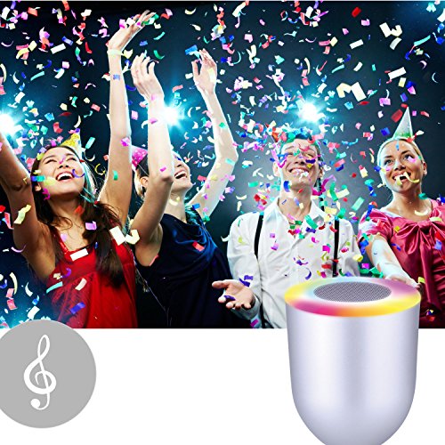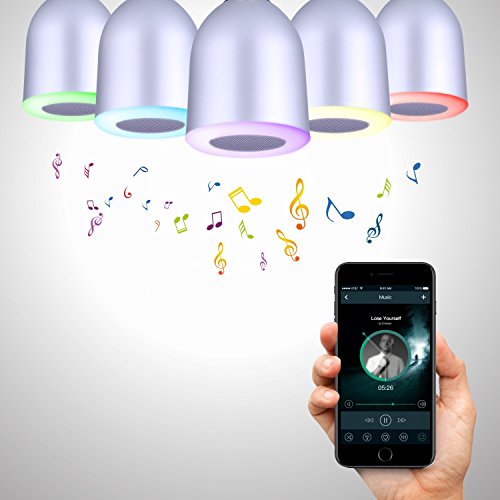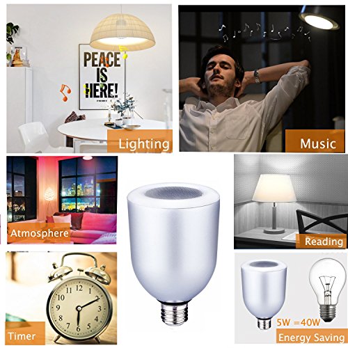 ? 6 in 1 Functions:Smart Light speaker,Wake and sleep timer alarm,Party color changing light,Shower mood light,Bright Day light,Bedroom night light.Enjoy the soft flood light sitting in the rocking chair,listening to the great music by bluetooth speaker bulb on the porch.