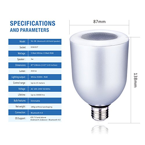 Modern pace of life,Adopt color changing light interact the music to sweep tired and city hustle Party and Disco Fun,Five color modes,differen color change,shine reflected glory of light and shadow of girl,enjoy light interact with music Fast Setup,Screw in E27 bulb,download free app "iLight Pro" and control bulb at your finger Timer & Wakeup Alarm,Set auto power on/off any time,support sound alarm wake up in the morning Night light,Adjust the bright and dim the color, set your sleep time to power off sound music Reading light,Dimmable soft white light and good listening,help your kids to practice listening Energy Savings,30,000 hours life and consume 5W about 80% energy save Specification: Socket:E26/E27 Power:5W Speaker:3W Lumen:480lm Control range:Up to 15meters Lifetime:30000hours Features:Dimmable Bulb weight:180g Connection:above iOS 7.0 and Android 4.3 with Bluetooth 4.0 Simply Operation: 1.Set E27 bulb speaker,turn on power 2.Scan code to download APP above iOS 7.0 or Android 4.3 and open bluetooth 3.Please operate APP to A.Adjust the bright B.360 all-round differen color and five color modes(normal,rhythm,rainbow,pulse,candle) C.Choose your purity music as you want D.Set time and music you want power on/off Package: 1x Light Bulb Bluetooth Speaker Note:Turn on power before APP Wireless controlled Connect APP to Newest Version 1.74 (more new version,more functionality)