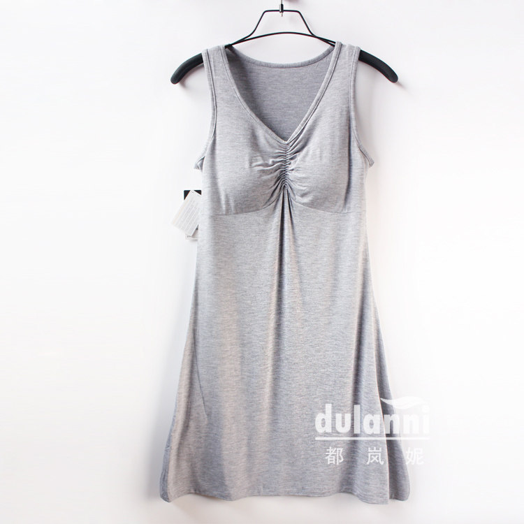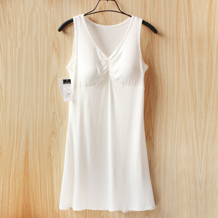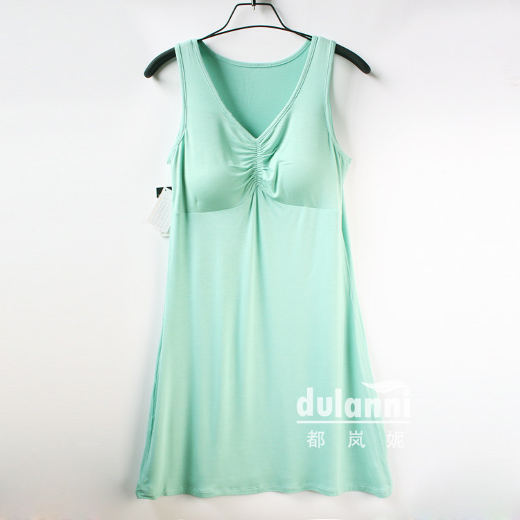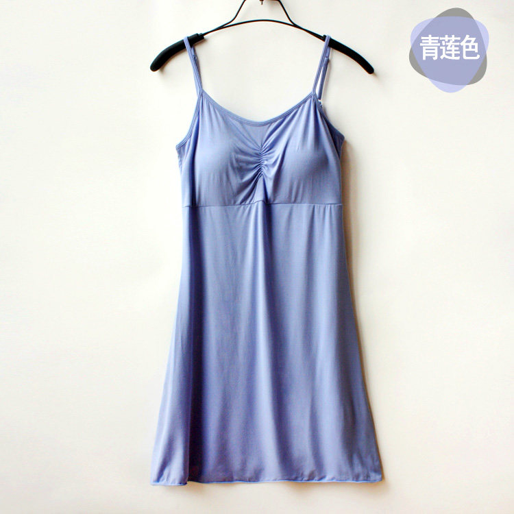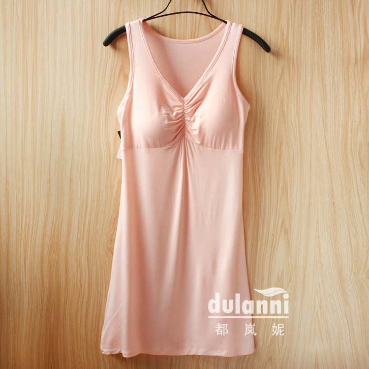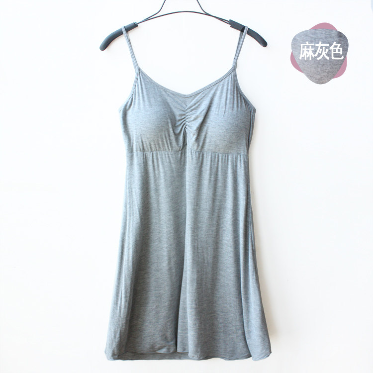 带胸垫,胸垫可以取出来,居家穿很实用,家里有其他的长辈或者晚辈,穿上这样的睡裙,不露点,很舒服!
