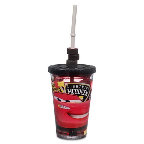 Double-walled sides filled with water, plastic racing flags, and glitter Cars screen graphics Clear acrylic design with translucent color lid Twist-tight lid with gasket and hole for straw Reusable straw features three tires, and flares at bottom so it won't fall out BPA free