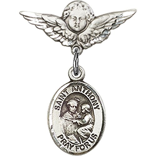 -. Title : Sterling Silver Baby Badge with St. Anthony of Padua Charm and Angel w/Wings Badge Pin 7/8 X 3/4 inches