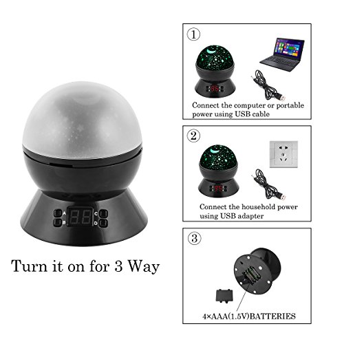 - Sleep Night Light funcition : 1.you should press the switch button 2. press A button to set the time firstly, 3.B button is the rotation switch,press twice to turn off rotation.4.C button is the switch for the light change color, 5.D button is the night lamp,it can be useable in the bedroom for baby kids adults nursery