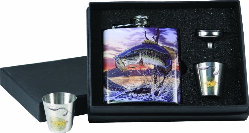 River's Edge Bass Design Stainless Steel Flask with Loading Funnel and Shot Glass