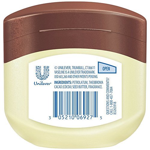 Vaseline® Jelly Cocoa Butter is packed full of skin nourishing benefits. Its moisturizing formula of petroleum jelly infused with cocoa butter works to help heal dull, dry skin and give skin a radiant, healthier look. Vaseline® Petroleum Jelly has long been used to help heal dry skin and is effective at locking in moisture. Our Vaseline® Jelly Cocoa Butter combines the healing benefits of Vaseline Jelly, with cocoa butter, which is known to nourish your skin. Healing Ingredients Vaseline® Jelly forms a protective barrier, to seal in moisture deep within the skin's surface layers and to enhance the skin's natural barrier recovery. Applying a layer of petroleum jelly helps protect the skin from extreme weather conditions. With its protective nature and moisturizing properties, Vaseline® Petroleum Jelly Cocoa Butter is great for tackling dull, dry skin. This product also is made with cocoa butter, which is known to be a great moisturizer, especially for particularly rough areas like elbows, knees, and heels. Simply apply Vaseline® Jelly Cocoa Butter daily to deeply condition, relieve, and rejuvenate dry skin. Gentle on Skin Vaseline® with Cocoa Butter isn't just good for dry skin; it's also gentle on skin. Vaseline® Petroleum Jelly Cocoa Butter is made with triple-purified petroleum jelly. It has also been dermatologist tested and is non-comedogenic, meaning it won't clog your pores. These factors make it perfect for daily use. The convenient, recyclable, flip cap jar makes it easy to access the moisturizing power inside with just one hand. Daily moisturization really is simple with Vaseline® Jelly Cocoa Butter. Choose Vaseline® Petroleum Jelly Cocoa Butter and you can maintain smooth, glowing skin all year round.Feature