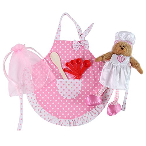 -. Feature : Adorable gift set for Mommy's little helper - fun for Christmas, Valentine's, birthdays, and everyday pretend play / Recommended for girls age 4 and up - Apron measures approx. 21 1/2" x 20" with 19" ties / Ideal for cooking & baking, theme parties, favors, gifts, dress up / Bear measures approx. 13" tall and is dressed in an adorable satin chef hat and apron pinafore / Includes apron with quality heart embroidery, organza drawstring gift bag, wooden spoon, measuring spoons and plush baker bear