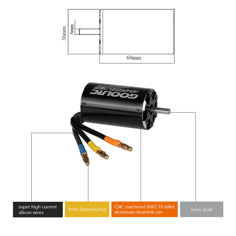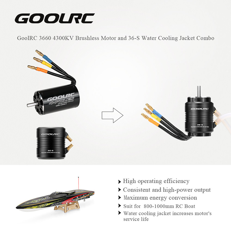 The original GoolRC 3660 4300KV brushless motor and 36-S water cooling jacket combo is designed to provide both quality and performance at an affordable price. The motor is designed with high power and rotation speed, the water cooling jacket helps the motor longer running time. Perfect for 800-1000mm RC Boat.