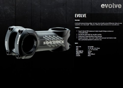 Studio : RaceFace Publisher : RaceFace Product Description Who says strength and performance have to be mutually exclusive? Certainly not us. The Race Face Evolve mountain bike stem is a great combination of strength and durability and race-oriented performance. The 6061 aluminum alloy is forged and blasted to take all the abuse the trails can dish out, while still being lightweight and stiff enough to ensure that it'll deliver the goods come race day. Strong, stiff and durable forged 6061 aluminum alloy construction Four bolt face plate help evenly distribute stresses Interlocking U-shape handlebar clamp holds the handlebars securely /- 6° rise so you can adjust the handlebar height to your preference 160 grams light 0