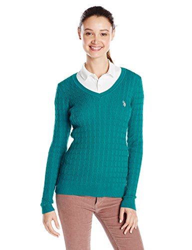Long-sleeve cable-knit sweater with V-neckline featuring embroidered logoing at chest