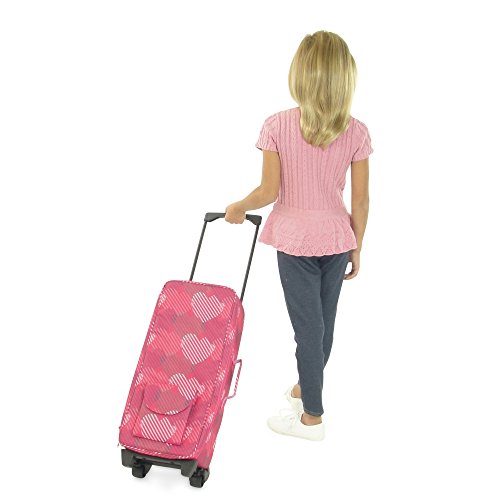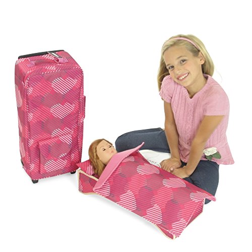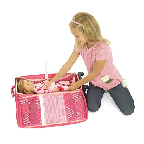 Your 18-inch doll can travel anywhere and sleep in comfort with this complete travel / doll carrier set. Durable pink travel case includes 2 straps, one to secure your doll in the bed and one to secure the bed in the case, along with multiple compartments to store extra clothes and accessories. The carrier is designed with a removable wheeled trolley, and backpack straps to provide multiple ways to transport your doll. When you reach your destination, a cute pink doll bed and matching bedding (pillow and blanket) can be removed to provide a restful place for your doll to spend the night! *Doll Not Included*Feature