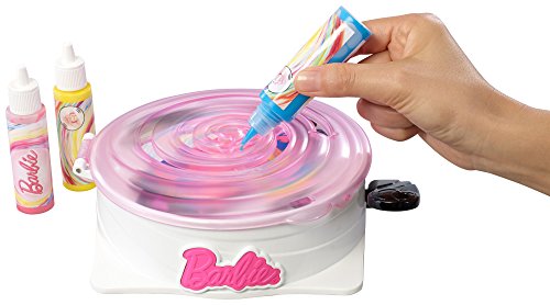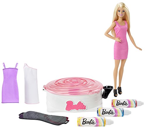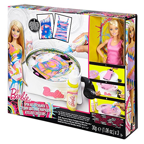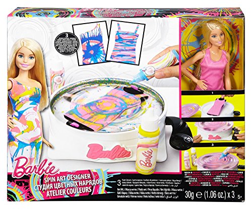 Create your own designs and let the fashion designer in you shine with the Barbie Spin Art Designer. Select your fashion, pick your paint colors and spin a new and unique design for Barbie doll! Young designers will love the fun of expressing their creative side and watching their ideas come to life. Every outcome will be different, and, with washable fashions, you can wash out a design and start all over for endless creative expression. Designing is easy. Choose one of three included washable dresses, and place it on the dress form. Different colors and trendy silhouettes provide options for numerous looks and styles. Attach the dress form to the spin art unit and close the pink lid. Select one of the three paint colors (pink, yellow and blue paints are included) and shake the bottle up. Pump the lever on the spin art unit to make it spin, and add paint drops through the holes on the unit's lid as it spins. Continue to pump the lever to allow the paint color to spread in cool and fun ways. Once you're happy with the amount of paint you've added, open the lid to reveal your custom-designed dress. Spin a little or a lot. Choose one paint color or all three. You decide because you're the designer! Dress the included Barbie doll in your fabulous spin art fashion and black booties that complement any style. Create fabulous looks to play out your own stories or display your designs. Young creative will enjoy the endless expression and storytelling possibilities because with Barbie, you can be anything! Includes Barbie doll wearing one washable fashion and shoes, the spin art unit, one dress form, two additional washable fashions and three bottles of paint. Doll cannot stand alone. Colors and decorations may vary.Feature