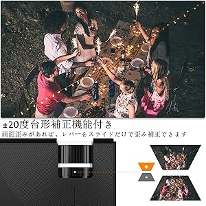 ±20度台形補助機能つき、画面歪み画あればレバーをスライドだけで歪身補正できます。