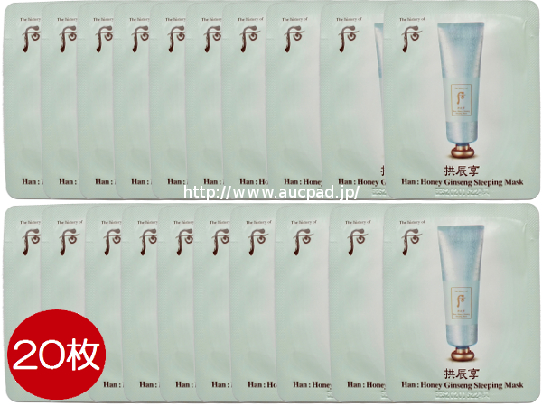 【商品説明】 韓国コスメの the history of 后 シリーズ- 肌秘策 寒(ハン) ハニー参(サム)マスク- 高麗人参と蜂蜜成分が寒タイプの肌に乾いた津液と不足している栄養を満たし肌を健康でしっとりと整えてくれる集中栄養マスクです。 【使用方法】 基礎ケアの最後の段階で適量を顔全体に塗り広げ吸収させます。 そのまま就寝し翌朝クレンジングして洗い流して下さい。 【内容量】 4ml × 20枚(20回分)