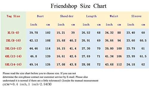 Friendshop Size Chart: US 6-8/Tag XL:Shoulder:15.35 inch/39cm---Bust:40.16 inch/102cm---Sleeve:23.62 inch/60cm---Length:26.77 inch/68cm---Waist:34.65 inch/88cm US 8-10/Tag XXL:Shoulder:15.75 inch/40cm---Bust:42.52 inch/108cm---Sleeve:23.62 inch/60cm---Length:27.17 inch/69cm---Waist:37.01 inch/94cm US 10-12/Tag 3XL:Shoulder:16.14 inch/41cm---Bust:44.88 inch/114cm---Sleeve:24.02 inch/61cm---Length:27.56 inch/70cm---Waist:39.37 inch/100cm US 12-14/Tag 4XL:Shoulder:16.54 inch/42cm---Bust:47.24 inch/120cm---Sleeve:24.02 inch/61cm---Length:27.95 inch/71cm---Waist:41.73 inch/106cm US 14-16/Tag 5XL:Shoulder:16.93 inch/43cm---Bust:49.61 inch/126cm---Sleeve:24.41 inch/62cm---Length:28.35 inch/72cm---Waist:44.09 inch/112cm 0