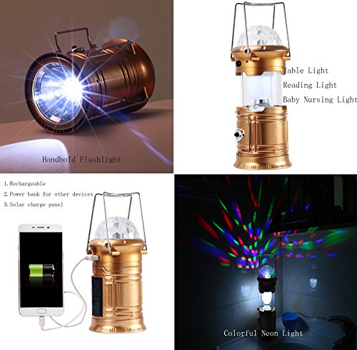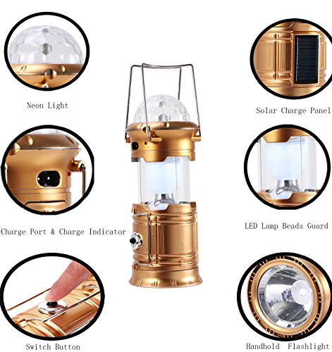 PORTABLE: Featuring lightweight and portable, this portable solar camping lantern could be used everywhere. Camping, Hiking, Night Reading, Baby Caring, Emergency Car Broken, Power Cut, Adverture. Besides, the colorful top neon light is a perfect choice for party.