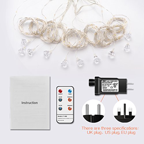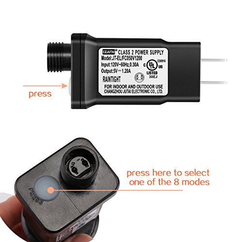 - Comfortable warm white lighting color, 8 light modes available: Combination, In waves, Sequential, Slo-glo, Chasing/flash, Slow fade, Twinkle/flash, Steady on. These modes can be controlled by BOTH the button on power adapter AND the RF remote controller.
