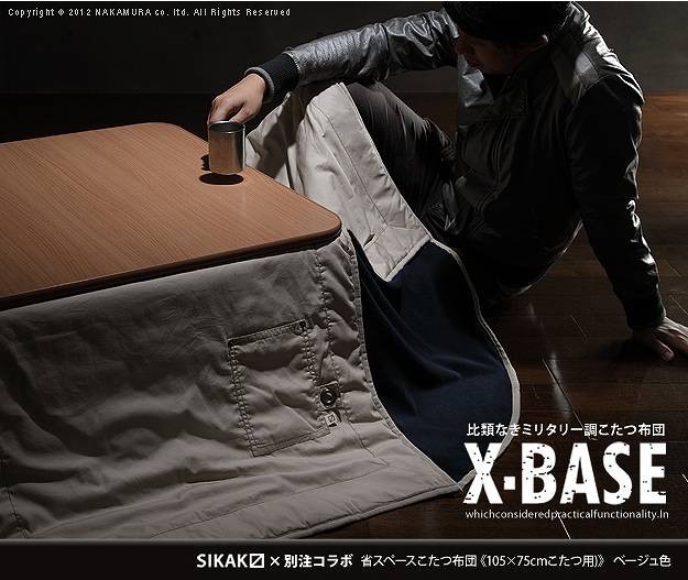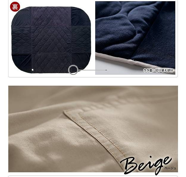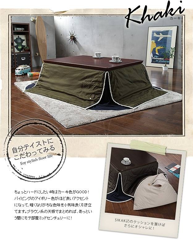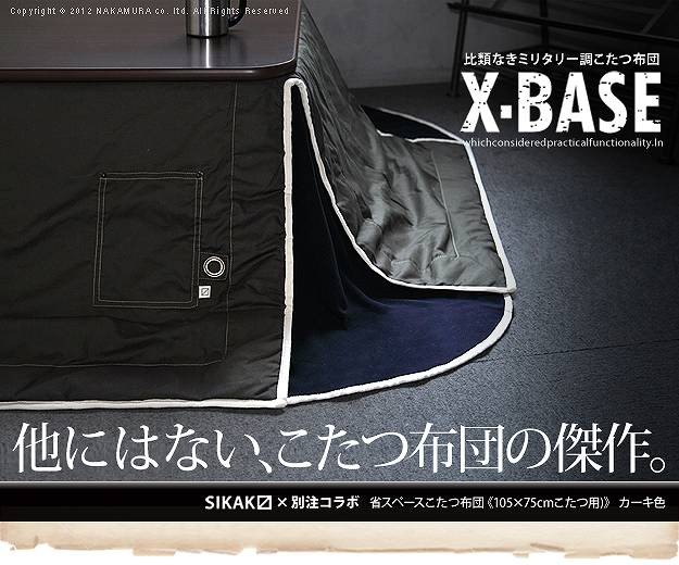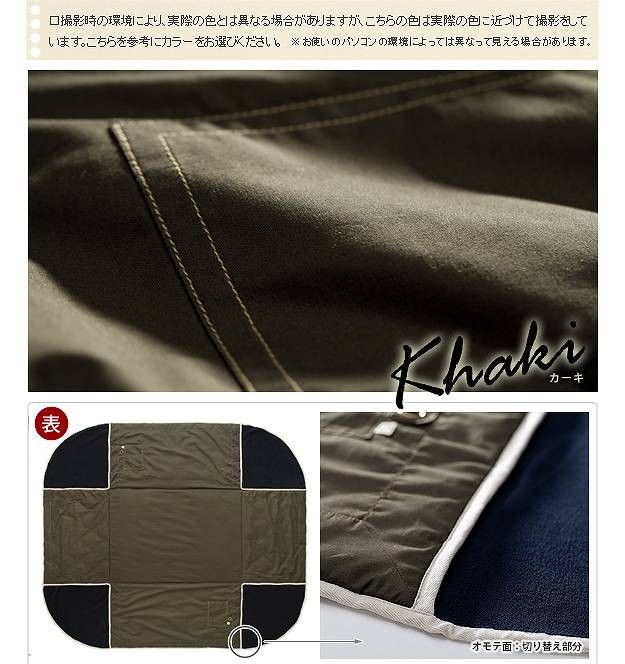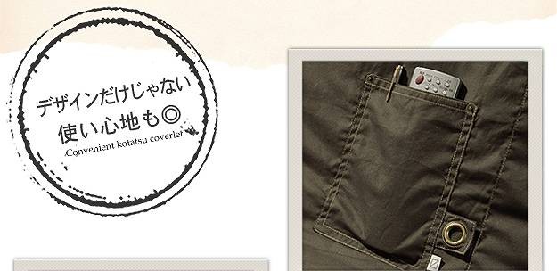 商品について:SIKAKと別注コラボした他にはないミリタリー調のクールなこたつ布団です。表地には丈夫でシワになりにくいツイル素材を使用。生地の風合いやアクセントのポケット、タグ、ハトメなど細部にもこだわってちょっぴりハードに仕上げました。利便性にこだわった省スペース設計で使う場所を選びません。手洗い×、ドライクリーニングOK。