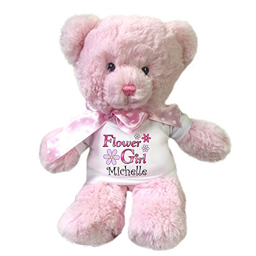 -. Feature : Soft, cuddly 12" Pink teddy bear / White T-Shirt P.R.Inted with Flower Girl Design / Personalized with name / Wedding couple's names and wedding date on back