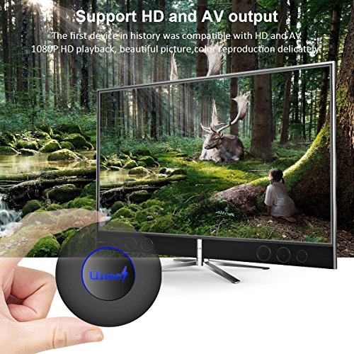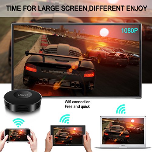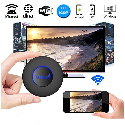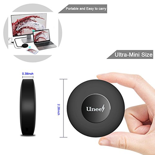 Studio : Unee1 Publisher : Unee1 Binding : Electronics Product Description ●Enjoy playing your games or watching videos on bigger screens? The Unee1 [2017 UPGRADE] WIFI Display Dongle is your best choice. ●With this1080P HD HDMI Dongle, You can easily enjoy your favorite movies, videos, music, photos, websites with your friend and family on a big HDTV screen. ●100% Brand New and good quality,Passed CE FC Rohs Certification. ●Note: 1.Please carefully check the package list and ensure that the product is intact,when you receive the package. 2.Before using, please be patient to read the instructions, which could help you use the product conveniently. 3.Any problem,please feel free to contact us. ●Main features: 1.Support 1080p full HD and AV dual output with marquee light 2.Supports 4 different transmission modes(Miracast, DLNA, Airplay and AirMirror)Airplay for iOS 8 above Miracast for Android 4.4 and Windows 8.1 above AirMirror for iOS 8 above DLNA for smartphone or tablet which is compatible 3.Supports the streaming of movies, videos, audio, TV, webcast and web browsing 4.Mirror your smartphone / tablet screen (photo, video, music, Word, Excel, Powerpoint, PDF, WebTV, Internet to a large HDTV (up to 1080p) ●Specification: Operating system: Linux Operating System RAM: DDR3 128MByte Port: HDMI 1.4a; Micro USB; 3.5mm headset interface(AV Output) CPU: RK3036 Cortex-A7 1.2GHz dual core ARM Storage: 16MByte SPI FLASH Memory: 128MByte memory DDR3 Network: 802.11 b/g/n 150Mbps 2.4GHz Decoding: H.264/H.265 1080p Power: 5V/1A Indicator: breathing effect by clockwise and counterclockwise Working Distance: Up to 10m Working Temperature: 0~50 Degree ●Package include: 1 X WiFi Display Dongle 1 X Micro USB Cable 1 X User Manual 1 X Audio Adapter Cable 1 X HDMI extension Cable
