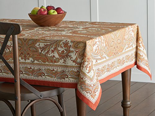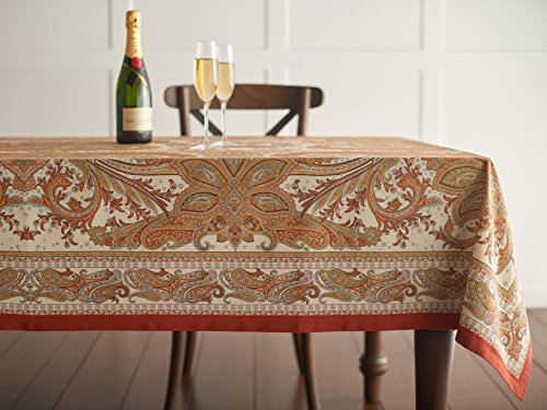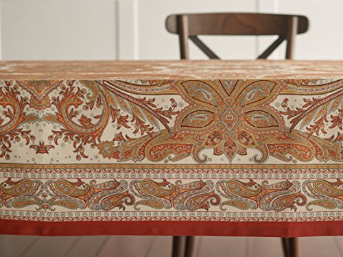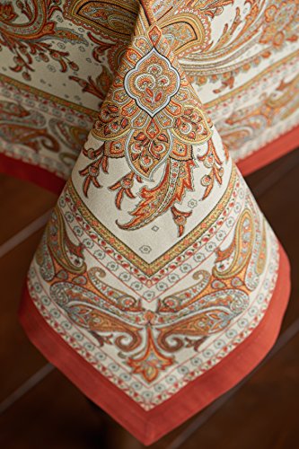 Studio : Aspero Publisher : Aspero Binding : Kitchen Product Description About the Product: This beautiful table cloth from the 'Kashmir Paisley' collection is just the right amount of ornate without being crowded. Intricate paisley patterns in warm colors emerge from a white background to create a stunning table cloth. This 100% cotton fabric from India has the right weight for a beautiful drape over your table. A band of smaller paisleys border the table cloth and it is all framed with a bright orange band .