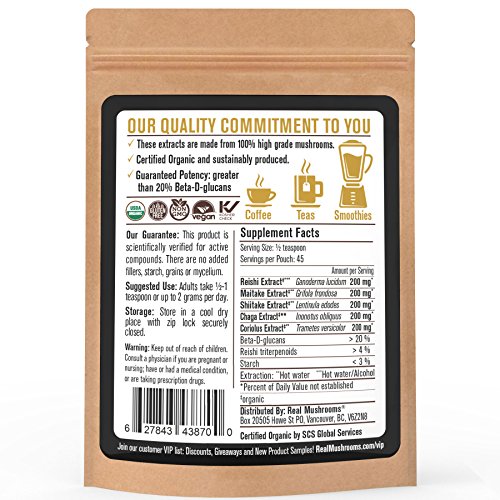 SHAKES | SMOOTHIES | COFFEE | TEA: Real Mushrooms 5 Defenders arrives in an easy-to-use airtight, resealable health grade packaging allowing for as much or as little use as you need for any occasion. For an extra health boost, add it into your coffee, tea, green smoothies, post-workout protein shakes, as an extra ingredient in your favorite recipes or maybe even an upgrade in your bulletproof coffee. Our extracts are 80-90% soluble in water.